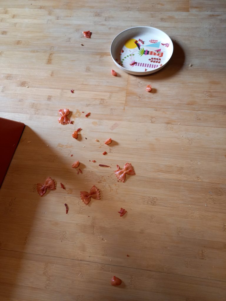 Heute gab es Fingernudeln. Max war begeistert, aber sie haben uns wohl die bisher größte Sauerei bereitet. Die Konsistenz war ziemlich weich, deshalb zermatschte er sie schnell. Allerdings wird er immer geschickter darin, Dinge aus den Händen in den Mund zu schieben. Heute hat er sogar eine Fingernudel, die er zu weit vorne gegriffen hatte, auf den Tisch gelegt und weiter hinten gegriffen.