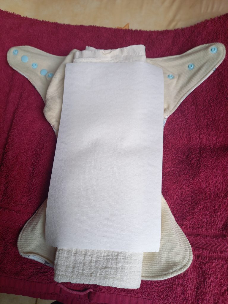 Ich verwende Überhosen, in die ich eine länglich gefaltete Mullwindel einlege. Über die Mullwindel kommt noch ein Windelvlies, das den groben Schmutz auffangen soll. Wenn alles übereinander gelegt ist, funktioniert das Anziehen im Prinzip wie bei Wegwerfwindeln. Natürlich muss man noch darauf achten, dass das Windelpaket gut sitzt, und dass die Mullwindel und das Vlies nicht aus der Überhose rausschauen, denn sonst wird die Hose nass.