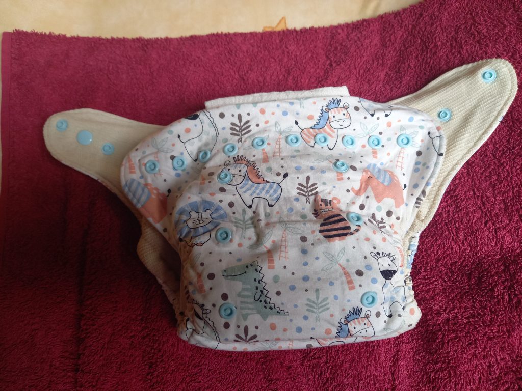 Meine Sorge, dass die Bodys dann nicht mehr passen, weil das Stoffwindelpaket doch um einiges dicker ist als die Wegwerfwindeln, war unbegründet. (Besonders praktisch finde ich da die Mitwachs-Bodys von Jako-o, die zwei Knopfreihen haben. Aber auch die anderen passen nach wie vor.)
